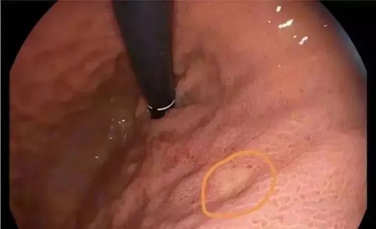 胃镜发现:胃体中部前壁一处直径约1.0cm的浅凹陷病变;