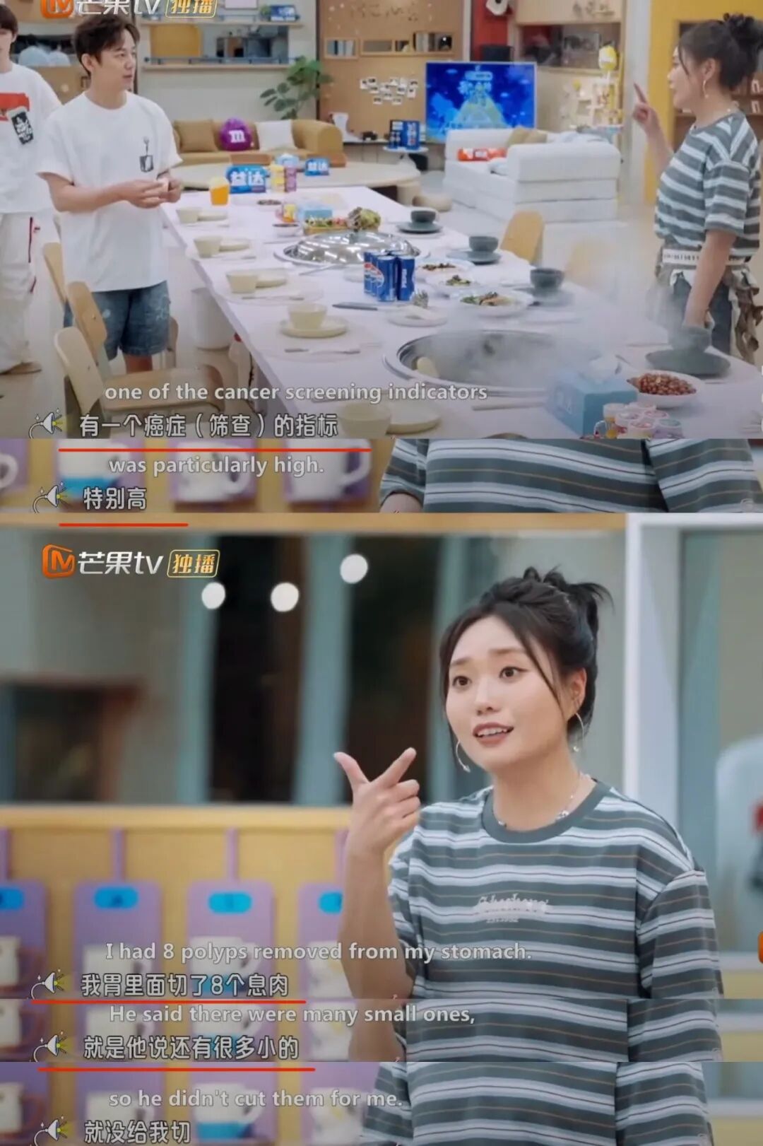 准备铁锅炖时,李雪琴说自己术后吃不了辣,何炅便问她为什么去做了肠胃镜。她答道说自己之前体检时发现某项癌症筛查指标是正常的5倍,便去做了肠胃镜检查,结果竟被切除了8个息肉,甚至还有很多小息肉还留在了胃里。把恰好在旁边听二人说话的丁程鑫吓得不轻。