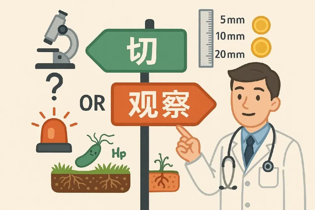 只要碰到任何一条“更危险”的因素(腺瘤性;≥1厘米;出血/外观可疑/长得快;胃部病变或家族史明显),我们就更倾向于切除。