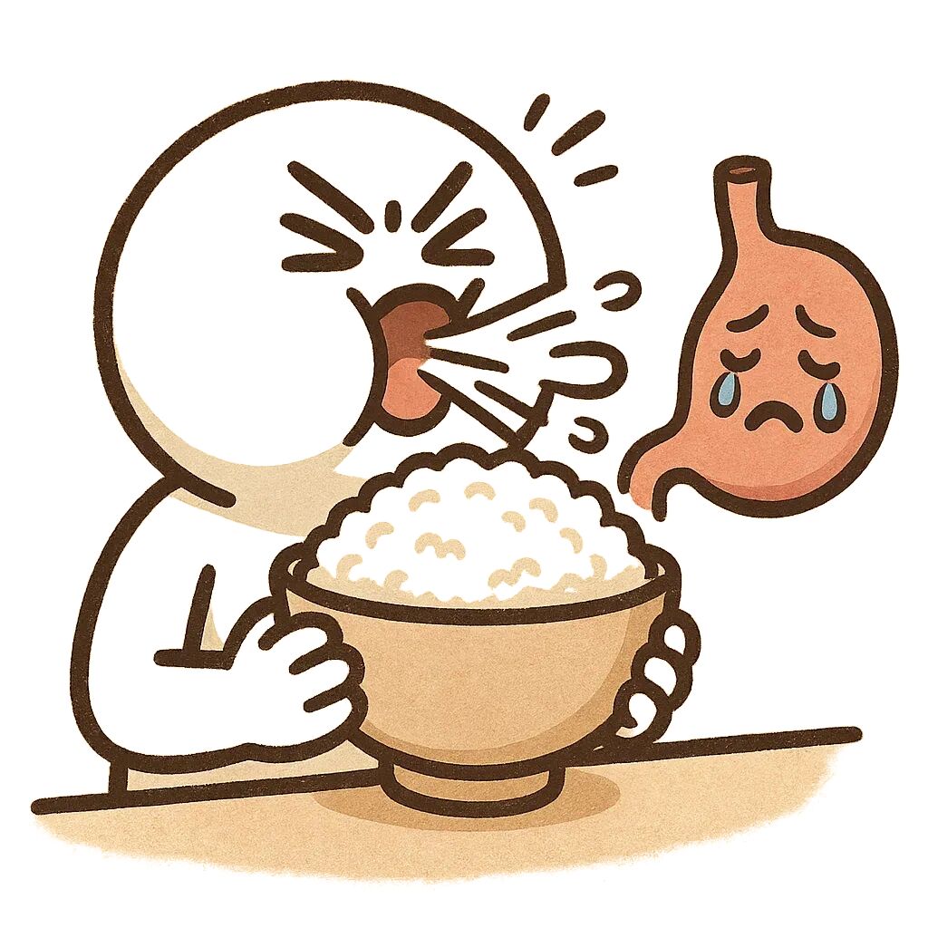 如果食物没被充分咀嚼,胃就要额外加班去处理大块的食物。结果往往是消化不良、又或者是分泌过多胃酸导致反酸、胃胀。更糟糕的是,快速摄入大量食物更容易导致过量摄入。