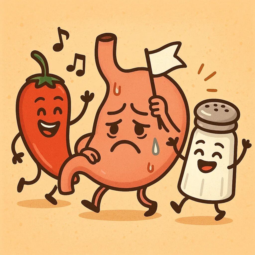 长期高盐、辛辣饮食,会损伤胃的保护屏障,让炎症、溃疡甚至癌变的风险上升。