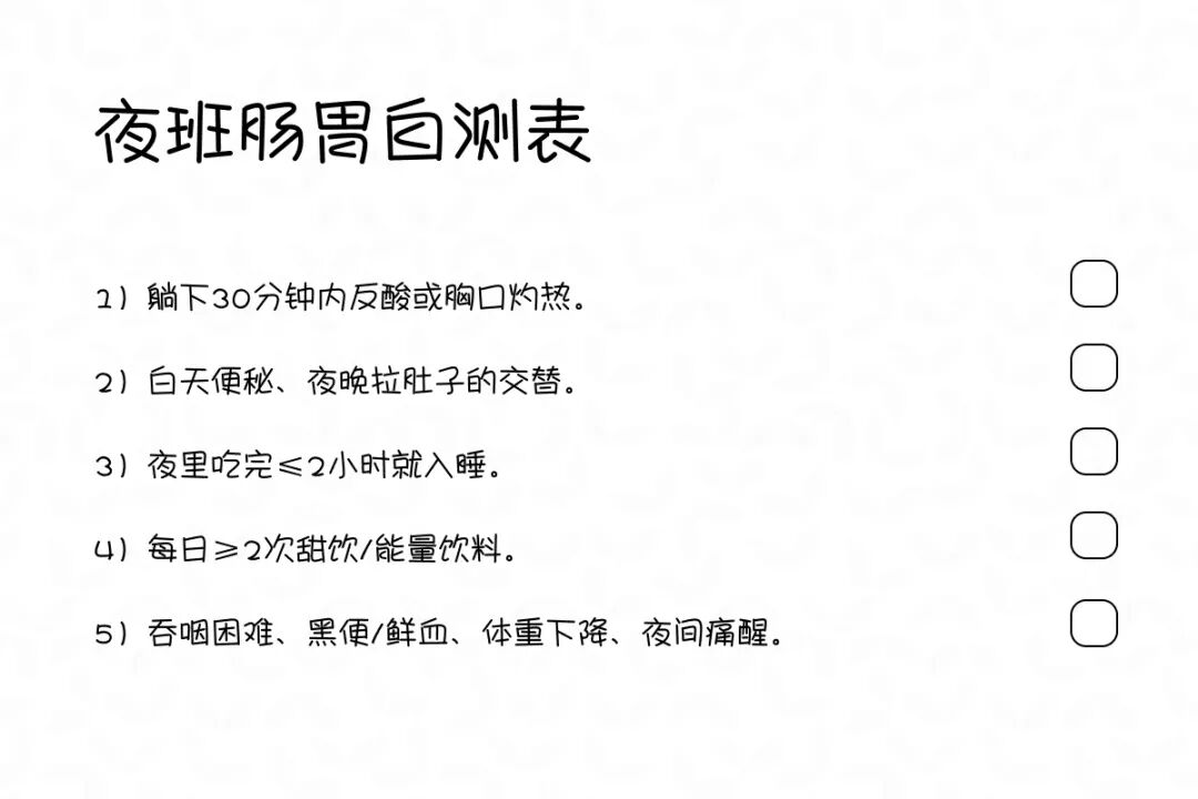 这里我们为大家准备了一份简单肠胃自测表,看看你的肠胃有没有在为你昼夜颠倒。