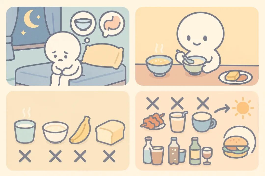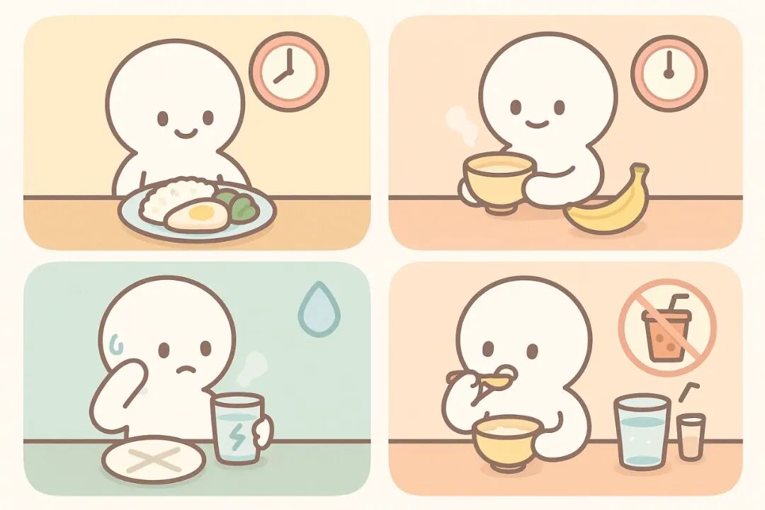 安心选择:清汤面/粥(汤不要太油)、蒸蛋/嫩豆腐、烤地瓜(半个即可)、温牛奶或无糖酸奶、香蕉半根、白面包片。它们共同点是温热、软烂、低脂、少渣,既补能量又不拖住胃排空。