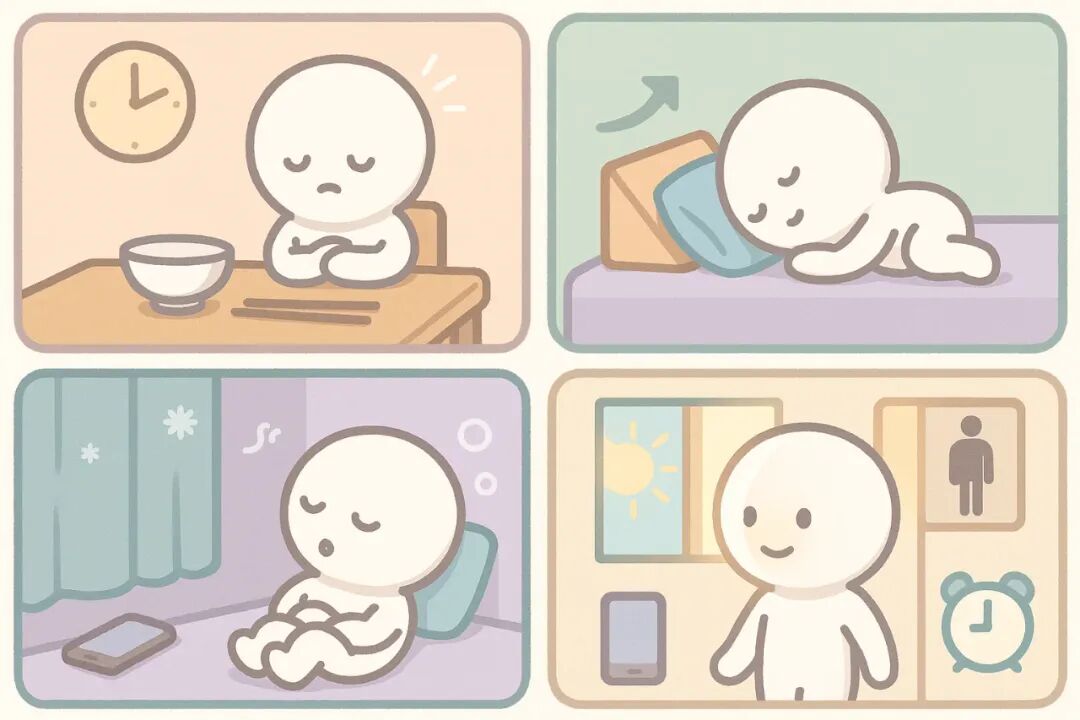 卧室环境要尽量遮光、安静、凉一点。手机放到门外,睡不着也别刷,可以做4轮缓慢呼吸,告诉身体现在要休息了。醒来后15–30分钟明亮光线(日光最好,实在不行用白光台灯),是重置“白天模式”的开关。