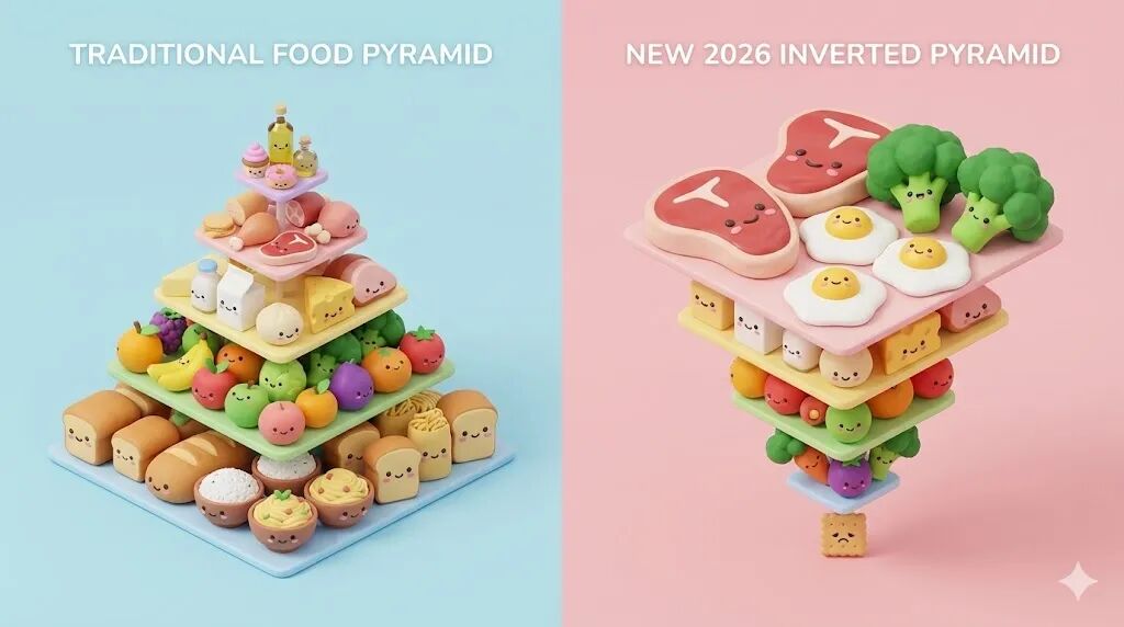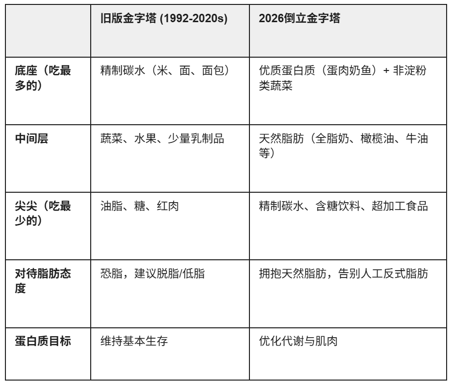 而令人没想到的是,就在前两天,那个一直被我们奉为健康圣经的图形,被美国卫生部和农业部亲手给掀翻了。没错,真的是物理意义上的掀翻——2026的新版膳食指南直接给出了一个倒立的金字塔!这波操作让不少人的营养学认知CPU瞬间干烧了。