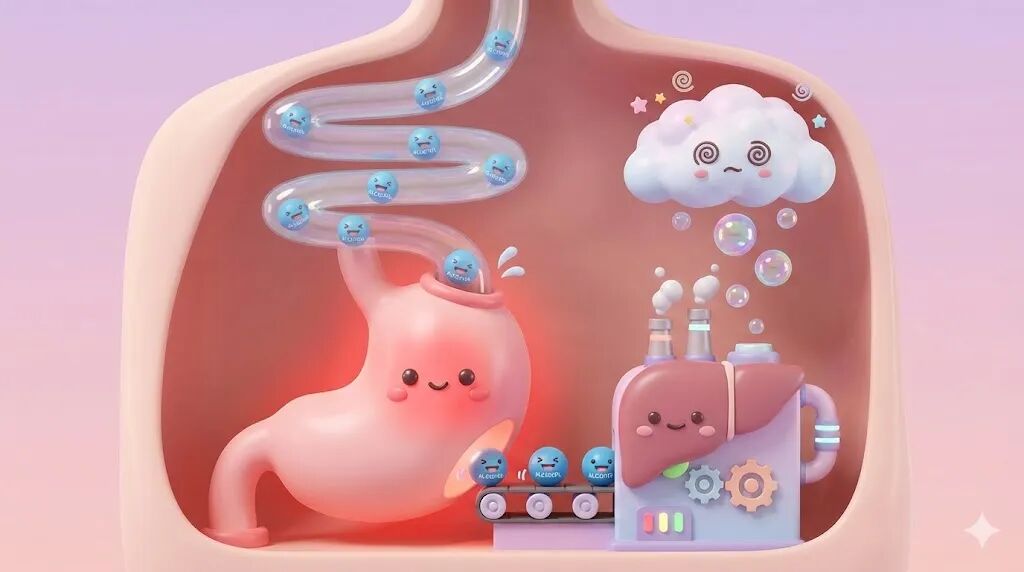 当第一口酒入喉,酒精的“人体漫游记”就正式发车了。别看乙醇分子个头小,它可是个社交达人,完全不需要消化过程,就能大摇大摆地穿过胃肠壁,坐上血液这辆高速列车直达全身。